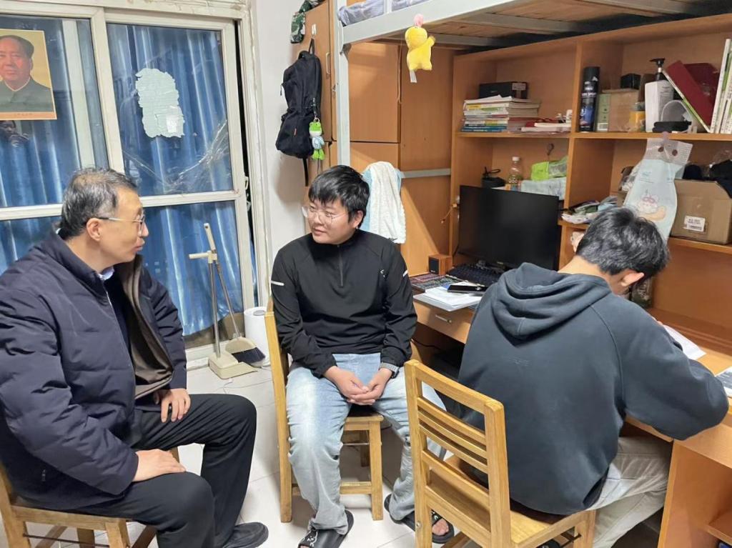 行至家庭经济困难学生宿舍,他深入了解学生日常开销、家庭负担等生活状况,并详细解读学校资助政策,确保每一位困难学生知悉申请流程、帮扶细节,让资助精准到位,助力学生安心学习。