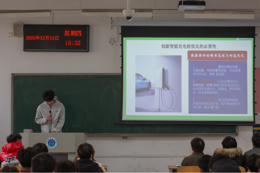 比赛现场,各参赛团队依次登台展示创新项目,项目亮点纷呈、干货满满。“智能出行管家APP”聚焦用户出行全场景需求、“智能充电桩优化方案”通过整合车辆保有量、交通流量、电网容量等数据实现精准选址与动态调整,“电动汽车电池梯次利用闭环运营”项目则紧扣新能源产业发展趋势,构建可持续的资源利用模式。这些项目既深度契合专业前沿方向,又兼具创新性与可行性,赢得了现场师生的热烈掌声。