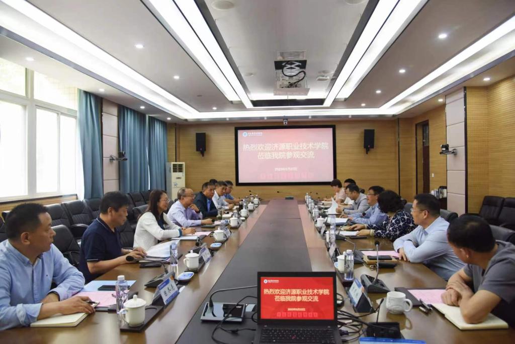座谈会上,梅乐堂介绍了学校“双高计划”建设情况,以及近年来学校改革创新的做法和经验。他指出,学校按照“以群建院”的原则调整二级学院设置,合理设置党政管理机构和其他教学、教辅部门,并根据建设发展需求进行定编、定岗、定责,有效提升了内部治理水平;学校把校企合作和国际交流作为驱动学院创新发展的“双动能”“双引擎”,实施“一群一院一平台”专业发展战略,探索实施工学结合、具有订单特色的人才培养模式,不断深化产教融合,提升人才培养质量;学校坚持以创新引领发展,从科研人员编制、激励政策、项目培育、服务平台建设等方面给与支持,注重科技创新、科研成果推广应用研究,主动对接行业企业,在科技创新和技术服务方面取得显著成效。他表示,济源职业技术学院到我校考察交流,为双方提供了宝贵的交流机会,希望两校加强合作、携手共进,为河南职业教育的高质量发展贡献积极力量。