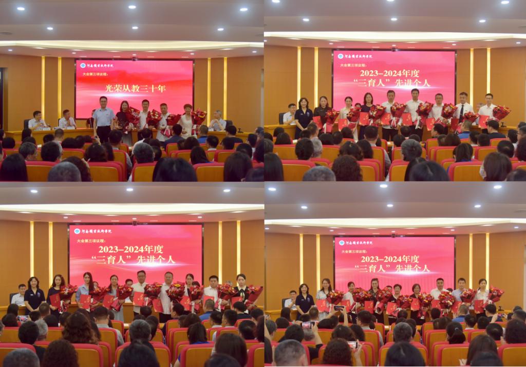 会上,全体教师齐唱国歌,并重温教师誓言;纪委书记盛兴文宣读《关于表彰光荣从教三十年教师的决定》和《关于表彰2023-2024年度“三育人”先进个人的决定》文件;厉励和夏新颜分别为光荣从教三十年的教师和“三育人”先进个人颁发荣誉证书和纪念品;梁杰、丁玉涛、蔡豪、霍书海等四位教师代表,分别结合自身工作经历从从教初心、育人使命、工作感悟等方面分享了教育心得体会;学生代表赵嘉伟结合在校学习经历、参赛经历分享了感念师恩的肺腑之言。