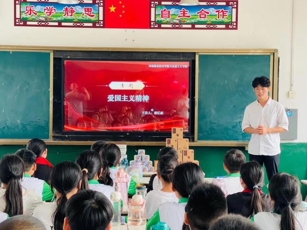 马院教师第一党支部成员张倩、田之涯、高地及学生潘亿豪开展思政课进校园活动,为辛安镇实验学校五年级一班的学生带去一堂以“爱国主义精神”为主题的思政课。