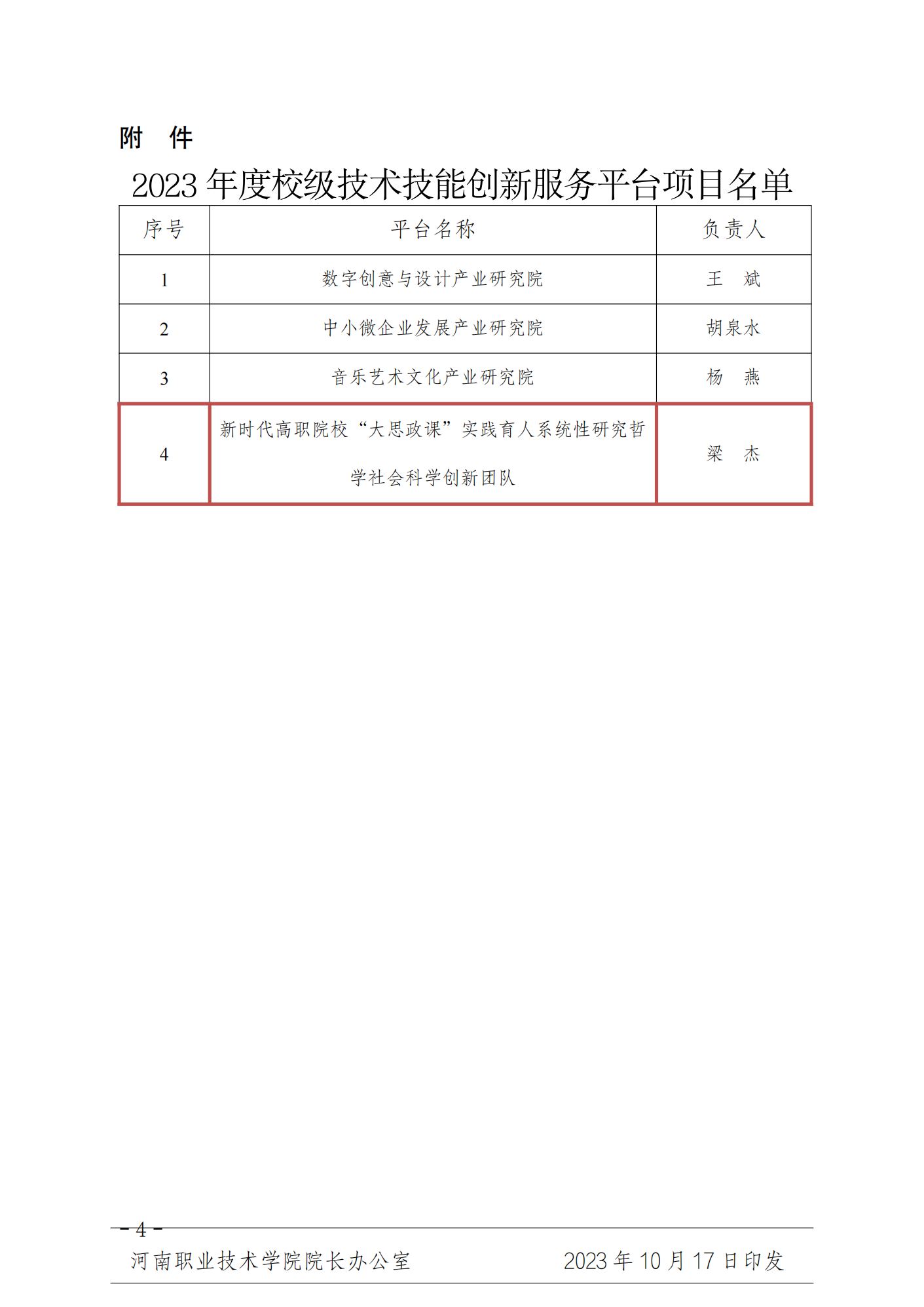 近日,学校组织开展了2023年度校级技术技能创新服务平台项目申报及评审工作。经专家评审及论证和院长办公会研究同意,马克思主义学院院长梁杰申报的《新时代高职院校“大思政课”实践育人系统性研究哲学社会科学创新团队》获批立项。