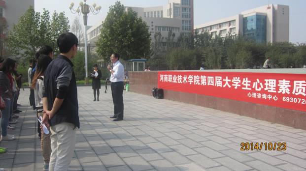 为贯彻落实中共河南省高校工委、河南省教育厅《关于开展全省高校心理健康教育宣传周活动》(教思政【2014】825)的文件精神,我院于10月20日——11月6日举办了“第八届大学生心理健康教育宣传周”活动,副院长彭志宏亲临活动现场进行工作指导,思政部主任、副主任全程参与,实地指挥,活动取得良好的效果。