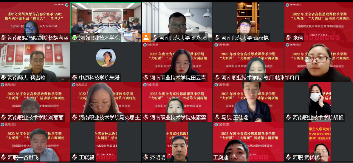11月29日,第六调研组组织召开了我校思想政治理论课教师线上座谈会,校党委书记李桂贞、校长梅乐堂出席会议,党政办公室、宣传部、团委、学工部、人事处、教务处、科技开发处、督导办公室等相关部门负责人,马院领导班子成员及部分思政课教师代表参会。会议由副校长肖珑主持。