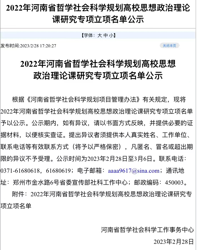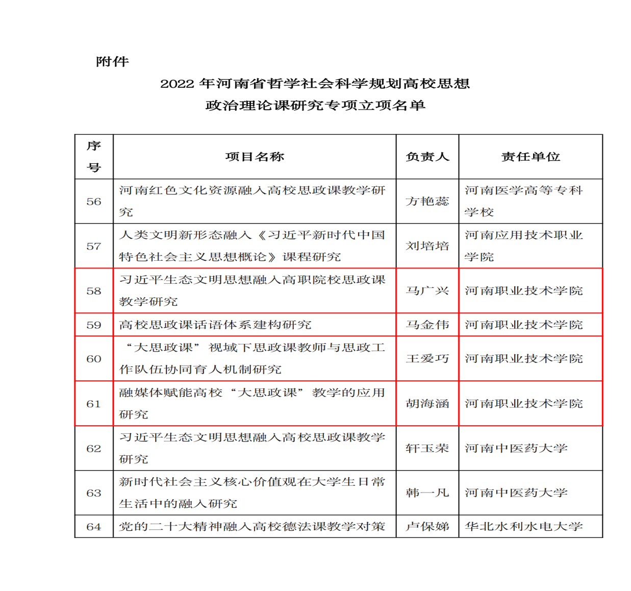 近日,河南省哲学社会科学工作事务中心公布了2022年河南省哲学社会科学规划高校思想政治理论课研究专项立项名单,我校马克思主义学院4个项目获准立项。分别是马金伟老师主持的《高校思政课话语体系建构研究》、胡海涵老师的《融媒体赋能高校“大思政课”教学的应用研究》、王爱巧老师主持的《“大思政课”视域下思政课教师与思政工作队伍协同育人机制研究》和马广兴老师主持的《习近平生态文明思想融入高职院校思政课教学研究》。我校是在此次课题申报中获批项目最多的高职院校。