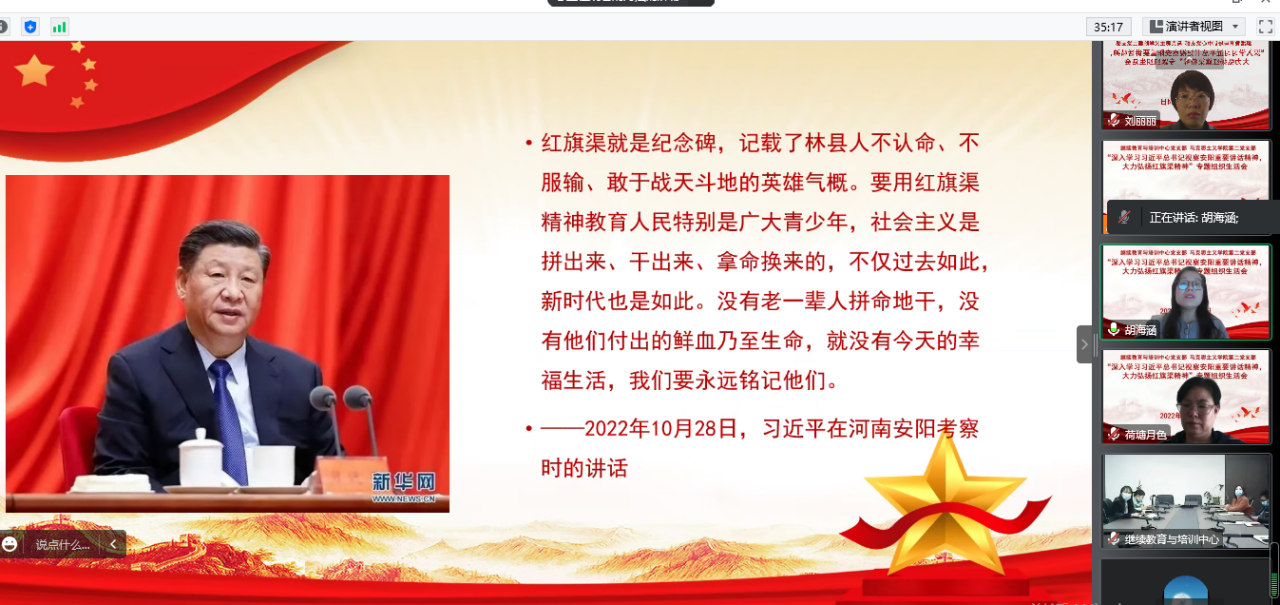 按照学校组织部关于《中共河南职业技术学院委员会关于以“深入学习习近平总书记视察安阳重要讲话精神,大力弘扬红旗渠精神”为题召开专题组织生活会的通知》的要求,为了深入学习党的二十大精神和习近平总书记视察安阳重要讲话精神,大力弘扬红旗渠精神,11月24日下午,马克思主义学院第二党支部与继续教育与培训中心党支部开展基层党支部“1+1”互融共建活动,通过线上+线下方式召开专题组织生活会,第二党支部和继续教育与培训中心党支部全体党员参会。