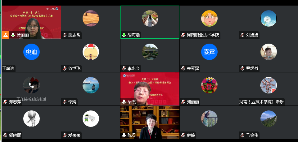 为进一步推进党的二十大精神“三进”工作,贯彻落实河南省教育厅下发的《关于上好高校思政课的指导意见》,用好教育部课件和高校思政课《教学要点及参考资料》,打造高水平思政课堂和高质量课程,12月1日下午,思想道德与法治教研室通过线上线下结合的方式组织召开了“党的二十大精神融入思想道德与法治课程(以下简称德法课)研讨备课会”。会议邀请了全国思政课名师工作室负责人、河南农业大学马克思主义学院陈娱教授线上指导,马克思主义学院院长梁杰、党总支书记马金伟、副院长胡海涵、副院长王爱巧和德法教研室全体专兼职教师参加。