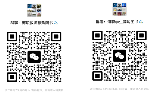 图书馆建立了“河职教师荐购图书”和“河职学生荐购图书”两个微信群,师生可扫描下方二维码加入荐购群,直接在群里发送荐购书单,入群请备注部门/班级+姓名,该二维码7天内有效。