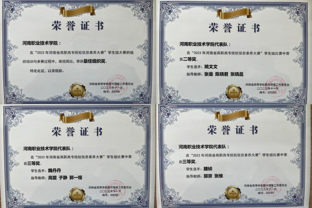 12月8日,第五届“全国高职高专院校信息素养大赛”总决赛在线上落下帷幕。经过激烈角逐,学生组方面:我校智能制造学院的姚文文同学荣获学生组全省二等奖,现代信息技术学院的魏丹丹同学、汽车与交通学院的魏祯同学荣获全省三等奖。教师组微课赛方面:我校图文中心张曼老师荣获全国三等奖、全省一等奖,郭一幔老师荣获全省二等奖,高盟、于静老师荣获全省三等奖。同时,高盟老师荣获全国优秀讲师荣誉称号。我校荣获全国最佳组织奖,河南省突出贡献奖、最佳组织奖。本届大赛由我校牵头承办组织成立了河南省组委会,并被评为国赛最佳贡献奖。该奖项也是自2019年大赛举办以来,河南省首次在国赛中荣获此荣誉称号。