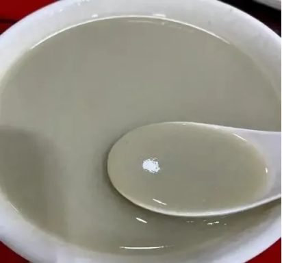 Douzhi has a gray-green color with clear separation. The top layer is a light green mung bean milk, while the bottom layer is a gray-green sediment.