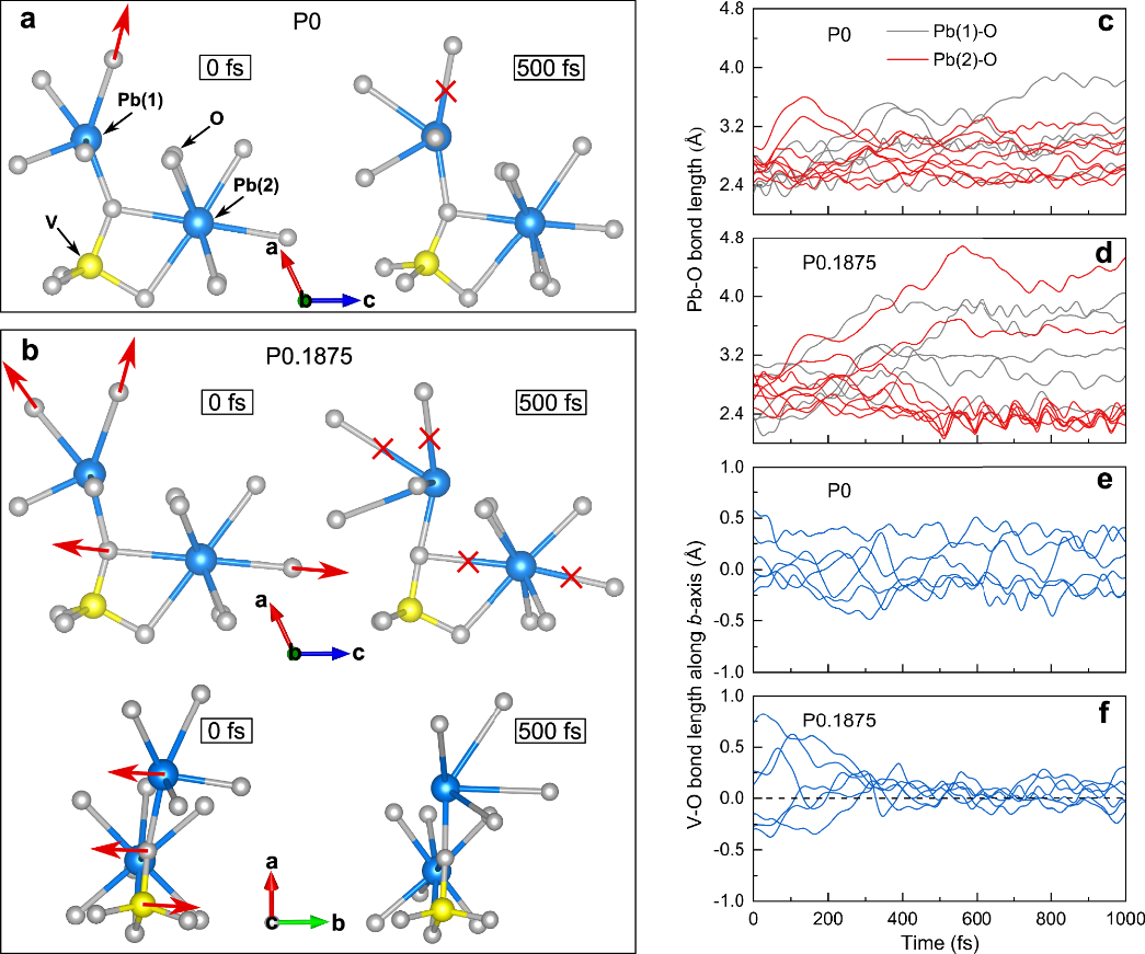 实验表明,随着P含量增加,材料从室温单斜晶相(β相)向高温菱方晶相(γ相)的转变温度逐渐降低至接近室温,形成多晶型相界PPB。在该区域内,β相与γ相共存,材料相组分对外界光刺激极为敏感。PPB区域的样品在405、520和655nm波长光照下均表现出显著的光致收缩行为,其中P掺杂量为0.22的样品在405纳米激光照射下光致伸缩效率达到1.75×10⁻¹⁰m³/W,较未掺杂样品提升近两个数量级。此外,研究还结合原位XRD和拉曼光谱揭示了光致相变的动态过程:低光强即可触发β相向γ相的转变,且相变比例随光强增加呈饱和趋势,与理论计算预测结果高度吻合。此外,密度泛函理论(DFT)和分子动力学模拟表明,磷掺杂通过降低β相与γ相的能量差,促进了光激发下Pb-O-V链的共线排列和V-V二聚体的形成,从而驱动晶格结构的快速重构。Pb3V2-xPxO8陶瓷这种兼具高应变和高效率的特性,标志着无机光致伸缩材料向实用化迈出关键一步,为开发微型光驱动执行器、光声器件等MEMS设备提供了理想材料体系。