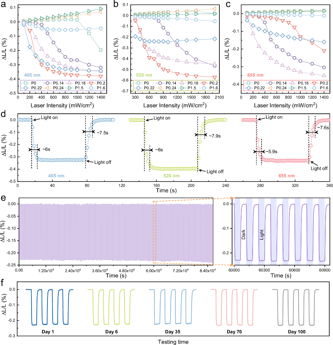近日,上海硅酸盐所易志国研究员与中国科学院半导体研究所骆军委研究员合作团队在Pb3V2O8陶瓷光致伸缩研究方面取得新进展。团队通过磷(P)掺杂调控Pb3V2O8陶瓷的相变温度,在室温附近构建多晶型相界(PPB),降低光致相变光强阈值,成功实现了超过0.3%的光致伸缩强度和高达10⁻¹⁰m³/W的光致伸缩效率。即使光强降低至200 mW/cm²,材料仍能输出高于0.1%的应变,与铁电材料的电致应变强度相当。这一成果不仅突破了传统光致伸缩材料的性能瓶颈,还大幅降低了对高光强的依赖,减少了光热效应带来的负面影响,为实际应用铺平了道路。