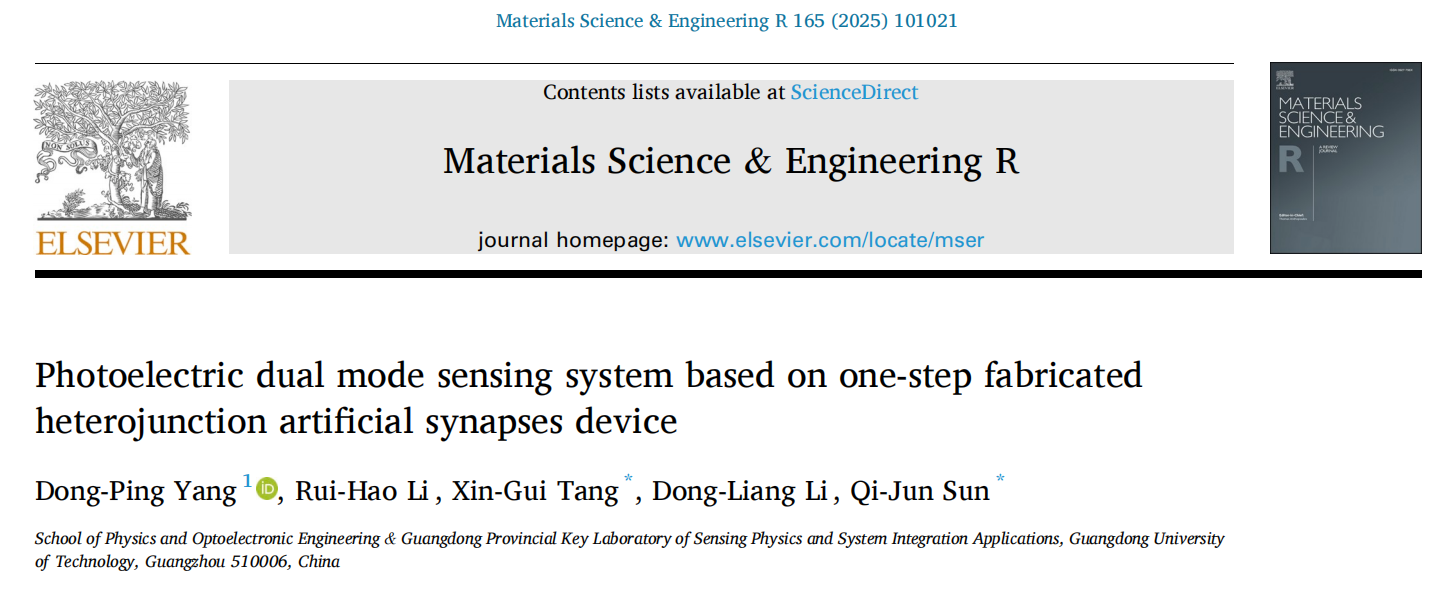 近日,广东工业大学唐新桂研究团队开发出一种融合传感器与忆阻器的架构的多模态感知系统。研究成果以“Photoelectric dual mode sensing system based on one-step fabricated heterojunction artificial synapses device”为题发表在国际著名期刊Materials Science & Engineering R (IF 31.6) 上,广东工业大学物理与光电工程学院博士研究生杨东平为本文的第一作者,广东工业大学唐新桂研究员、孙启军副教授为论文共同通讯作者。