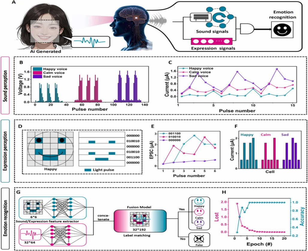 图3.(A)多模态感知系统用于实现人类情感识别。(B)不同人类情感下的电压脉冲信号(传感器)。(C)不同电压脉冲信号下的输出电流(忆阻器)。(D)通过捕捉面部特征获得的光脉冲序列。(E)不同光脉冲序列下的EPSC响应。(F)不同情感下的综合输出电流。(G)基于面部特征和声音特征的情感识别卷积神经网络模型。(H)20个周期内情感识别的准确率和损失值。