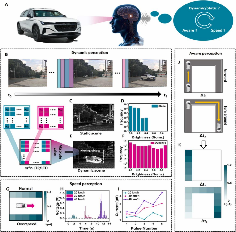 图2.(A)多模态感知系统用于实现车辆速度/动态/方向的感知。(B)从t0到t1的时间段内汽车的信息流场景。(C)静态场景下帧差动态识别算法的照片输出。(D)静态场景下帧差动态识别算法的亮度输出。(E)动态场景(汽车出现并移动)下帧差动态识别算法的照片输出。(F)动态场景下帧差动态识别算法的亮度输出。(G)不同速度下的汽车EPSC映射。(H)通过压阻传感器测量不同速度下车辆的输出电压。(I)输入不同速度电压脉冲后忆阻器的输出电流。封闭路段上汽车的行驶方向。(J)和薄膜器件对应的EPSC映射。