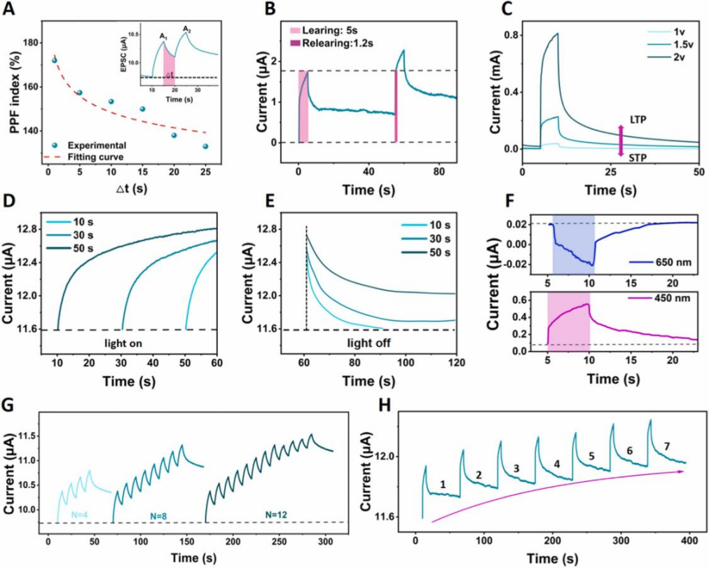 图1.(A)双脉冲促进行为的PPF指数。(B)在光学脉冲模拟下,薄膜器件的学习一再学习机制。(C)器件光响应电流的电压依赖性。(D)薄膜器件在光开启时,光响应电流随光学脉冲宽度的变化。(E)薄膜器件在光关闭时,光响应电流随光学脉冲宽度的变化。(F)在450 nm和650 nm光源下,器件的光响应行为。(G)薄膜器件光响应电流随光学脉冲数量的变化。(H)在多次光学脉冲刺激下,薄膜器件的不同电导状态。