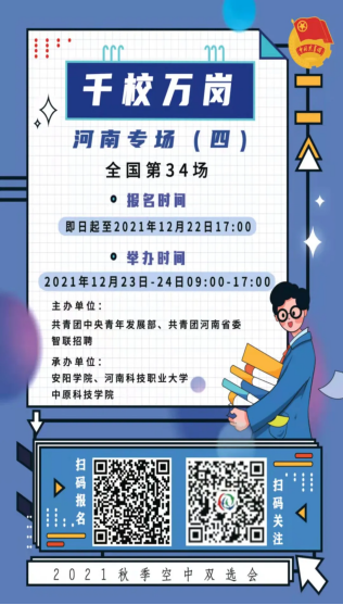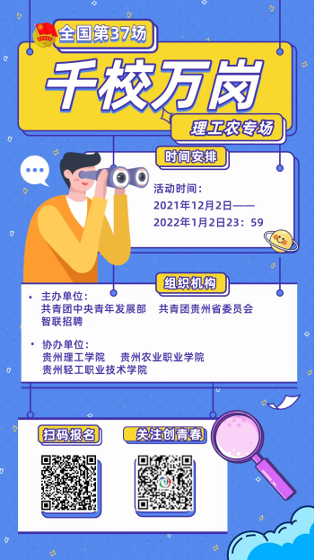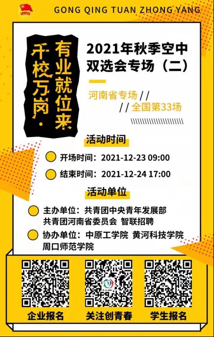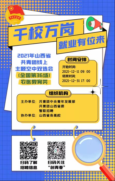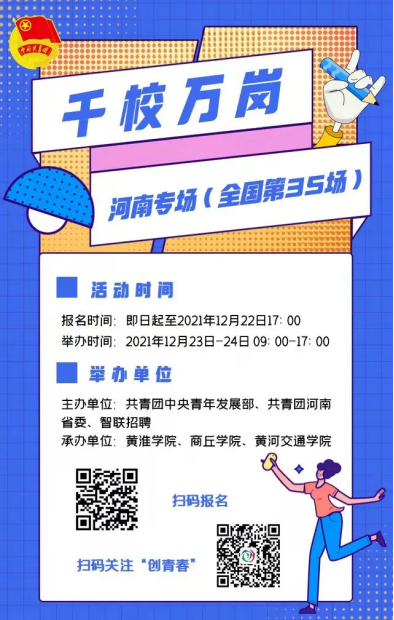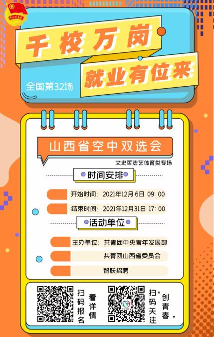 近日,由团中央青年发展部联合各省级团委、智联招聘举办的“千校万岗·就业有位来”线上线下招聘会开始了,共有山西、河南、贵州、吉林四个省份七个专场,具体时间地点及企业岗位信息可扫描海报二维码查看详情。