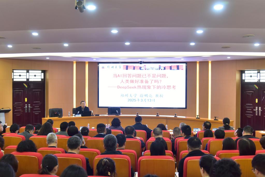 3月13日下午,河南职院召开党委理论学习中心组(扩大)学习会,专题学习AI及DeepSeek发展趋势与应用。郑州大学科学技术研究院院长、二级教授徐明亮应邀作《当AI回答问题已不是问题,人类做好准备了吗?——DeepSeek热现象下的冷思考》专题报告。全体校领导、中层副职及以上干部,思政课教师、辅导员及学生代表参加学习会。校党委副书记、工会主席田华主持会议。