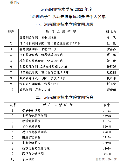 附件:河南职业技术学院2022年度“两创两争”活动先进集体和先进个人名单