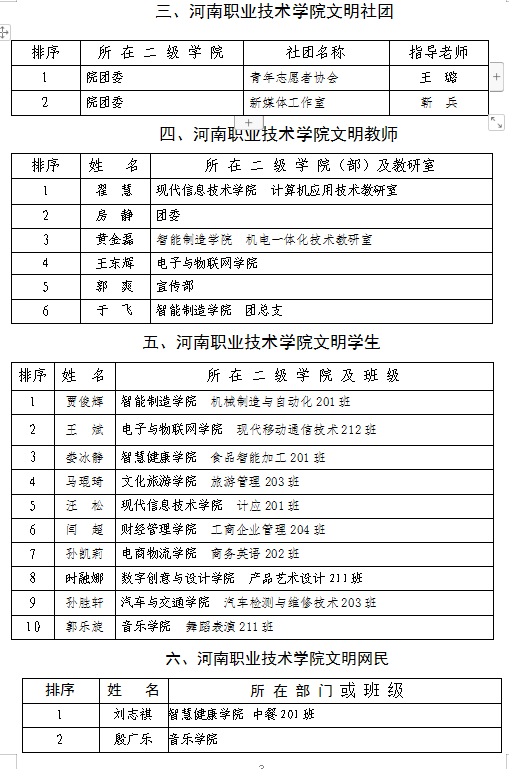 根据《中共河南省委高校工委河南省教育厅关于开展2022年度全省教育系统“两创两争”活动先进集体和先进个人推选工作的通知》(豫教工委〔2022〕34号)要求,学院开展了相应推选工作。经个人申报、部门推荐、专家评审,拟分别授予智能制造学院机制204班等10个班级、智能制造学院3411A宿舍等10个宿舍、青年志愿者协会等2个社团、翟慧等6名教师、贾俊辉等10名学生、殷广乐等2人“河南职业技术学院文明班级”、“河南职业技术学院文明宿舍”、“河南职业技术学院文明社团”、“河南职业技术学院文明教师”、“河南职业技术学院文明学生”、“河南职业技术学院文明网民”荣誉称号,现将结果予以公示。
