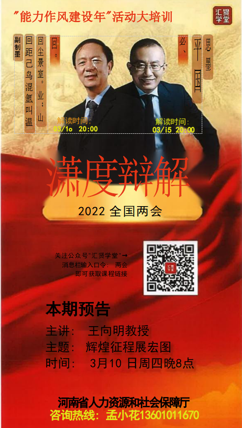 3月10日(周四)晚20:00,由中国人民大学继续教育学院推出的“汇贤名家讲坛”,将邀请中国人民大学习近平新时代中国特色社会主义思想研究院王向明副院长,以“辉煌征程展宏图”为主题对全国两会精神进行深度解读。为推进我校“能力作风建设年”活动走深走实,请各部门收到通知后,积极组织本部门教职工扫描下方二维码,自主进行在线学习。