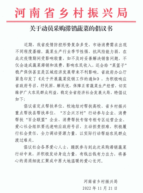 河南省乡村振兴局关于动员采购滞销蔬菜的倡议书