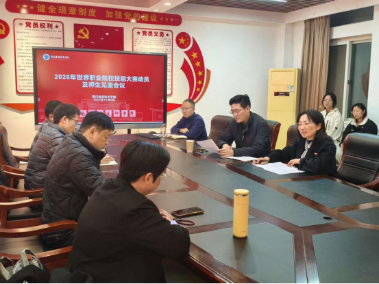 李纪云作了动员讲话。她首先强调了世界职业院校技能大赛在检验教学成果、提升学生实践创新能力、深化教育教学改革等方面的重要意义。她指出,大赛是参赛选手技术水平和综合素养全面飞跃的重要平台,所有的努力和奋斗终将获得回报。她最后表示,学院将是备赛师生的坚强后盾,将全力做好各项保障工作,期待大家以昂扬的斗志和精湛的技艺,在2026年的赛场上为校争光。