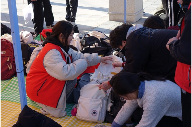清晨6:50,考场外已是一片忙碌景象。身着红色志愿服的志愿者们有条不紊地进行准备工作,包括摆放桌椅、搭建帐篷、布置服务台、设置手机及贵重物品存放箱、铺设行李地垫等。学院提前一周组建了师生专项服务保障小组,针对考生需求制定了详细的服务方案。服务点不仅提供现场咨询、行李存放、路线指引等基础服务,还特别准备了应急药品保障箱,为考生提供贴心保障。