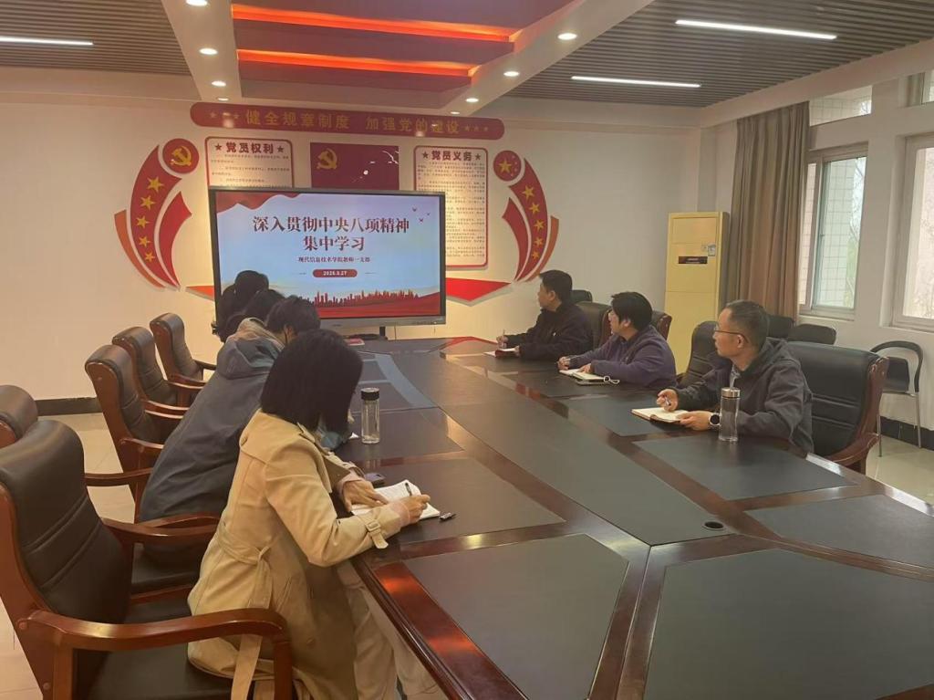 3月27日下午,现代信息技术学院教师第一党支部在笃行楼508会议室召开专题学习会,深入学习贯彻中央八项规定精神。支部全体党员参加了学习,会议由支部书记翟慧主持,纪检委员翟煜锦担任主讲人。通过理论讲解与案例分析相结合的方式,翟煜锦同志带领全体党员深刻领会中央八项规定精神的核心要义和实践要求。