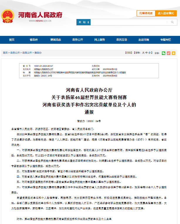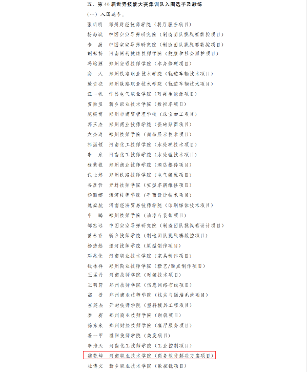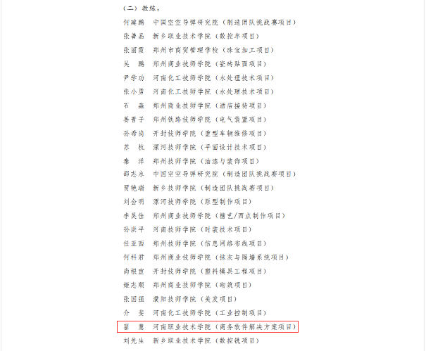 近日,河南省人民政府办公厅公布了“河南省人民政府办公厅关于表扬第46届世界技能大赛特别赛河南省获奖选手和作出突出贡献单位及个人的通报”,现代信息技术学院教师翟慧在“商务软件软件解决方案项目”入围第46届世界技能大赛集训队教练,现代信息技术学院计算机应用技术专业学生魏乾坤在该项目中入围第46届世界技能大赛集训队选手。