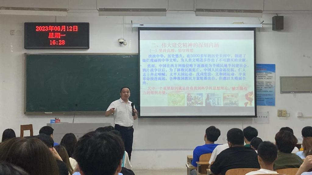 张俊峰从四个方面讲解了伟大建党精神的深刻内涵:以“坚持真理、坚守理想”涵育理想信念,以“践行初心、担当使命”激发担当作为,以“不怕牺牲、英勇斗争”淬炼奋斗精神,以“对党忠诚、不负人民”厚植爱国情怀。希望同学们树立远大理想,坚定青年马克思主义信仰,从历史的纵深处找寻初心,培养吃苦耐劳、自强不息的品质,增强团结奋斗、协作共赢的本领能力,培养爱国之情,砥砺强国之志,实践报国之行。