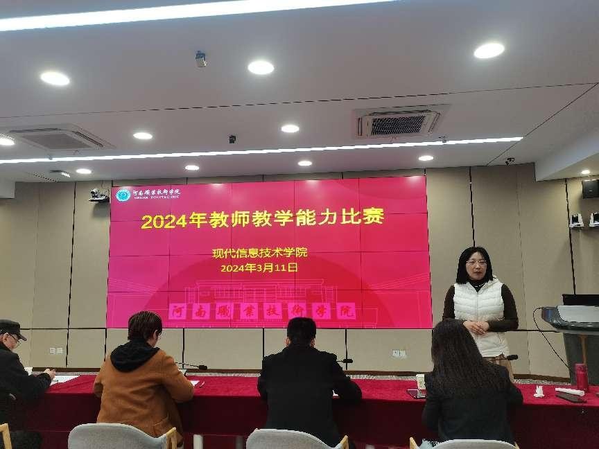 3月11日下午,现代信息技术学院在明知楼3110举办2024年教师教学能力比赛现场赛。以新时代职业教育发展思想为指导,以赛促教、以赛促学、以赛促改、以赛促研,全面提升学院教师素质素养、专业技能水平和创新能力。比赛特邀校内多次参加教学能力比赛的5位教师担任评委,大赛由李纪云院长主持。