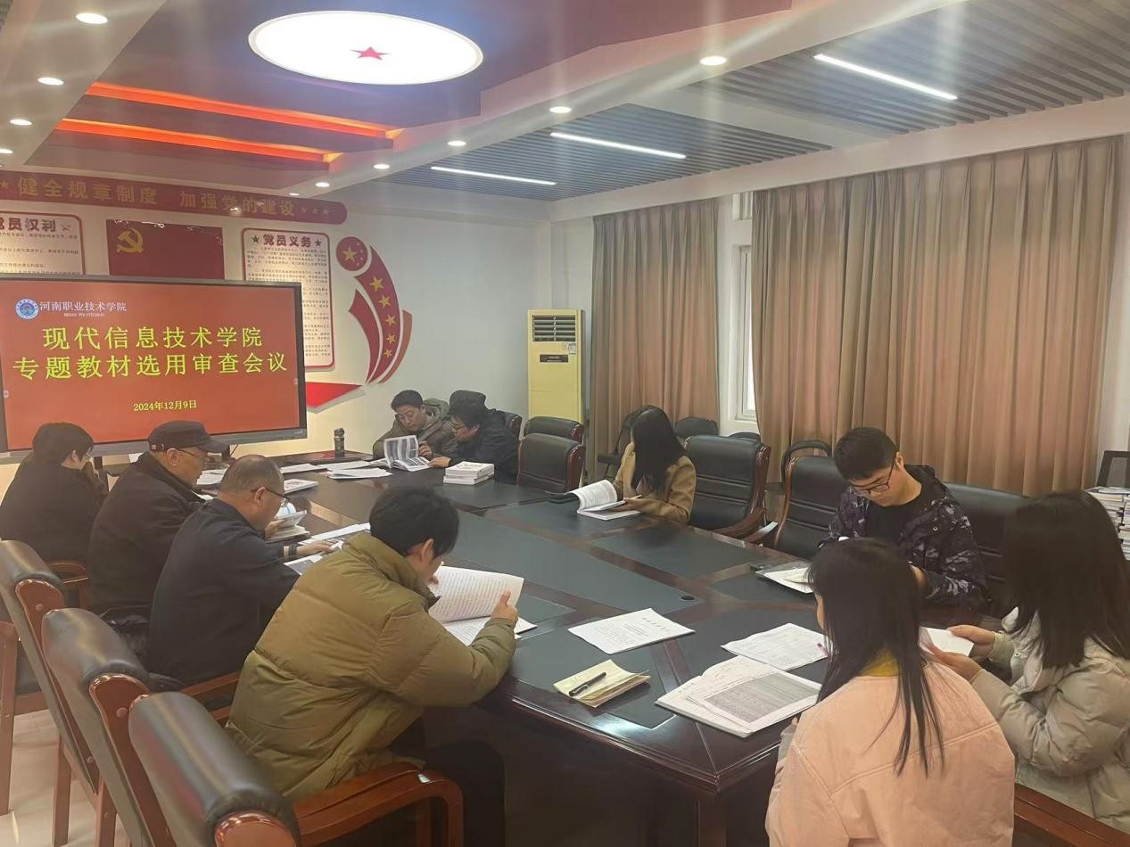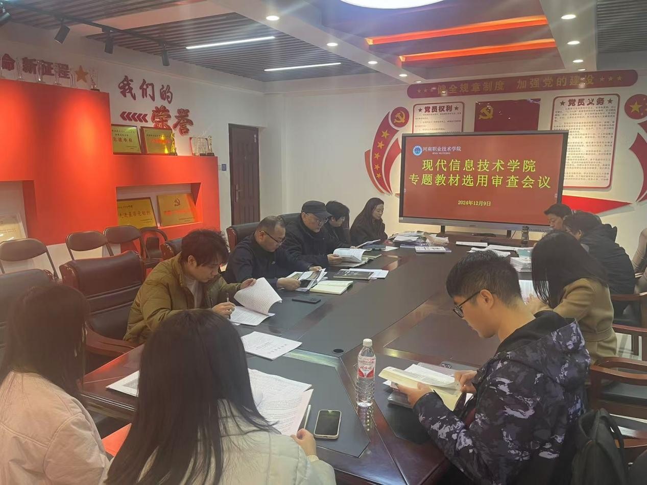 为加强和规范教材建设与管理,提高教材选用质量,现代信息技术学院成立了由学院领导班子成员、教研室主任、高级职称教师代表、马克思主义学院专家、图文专家、教学秘书和行业企业专家组成的教材选用委员会,并于12月9日下午在笃行楼508会议室召开2024-2025学年第二学期教材选用审查会议,会议由副院长孙杰主持。