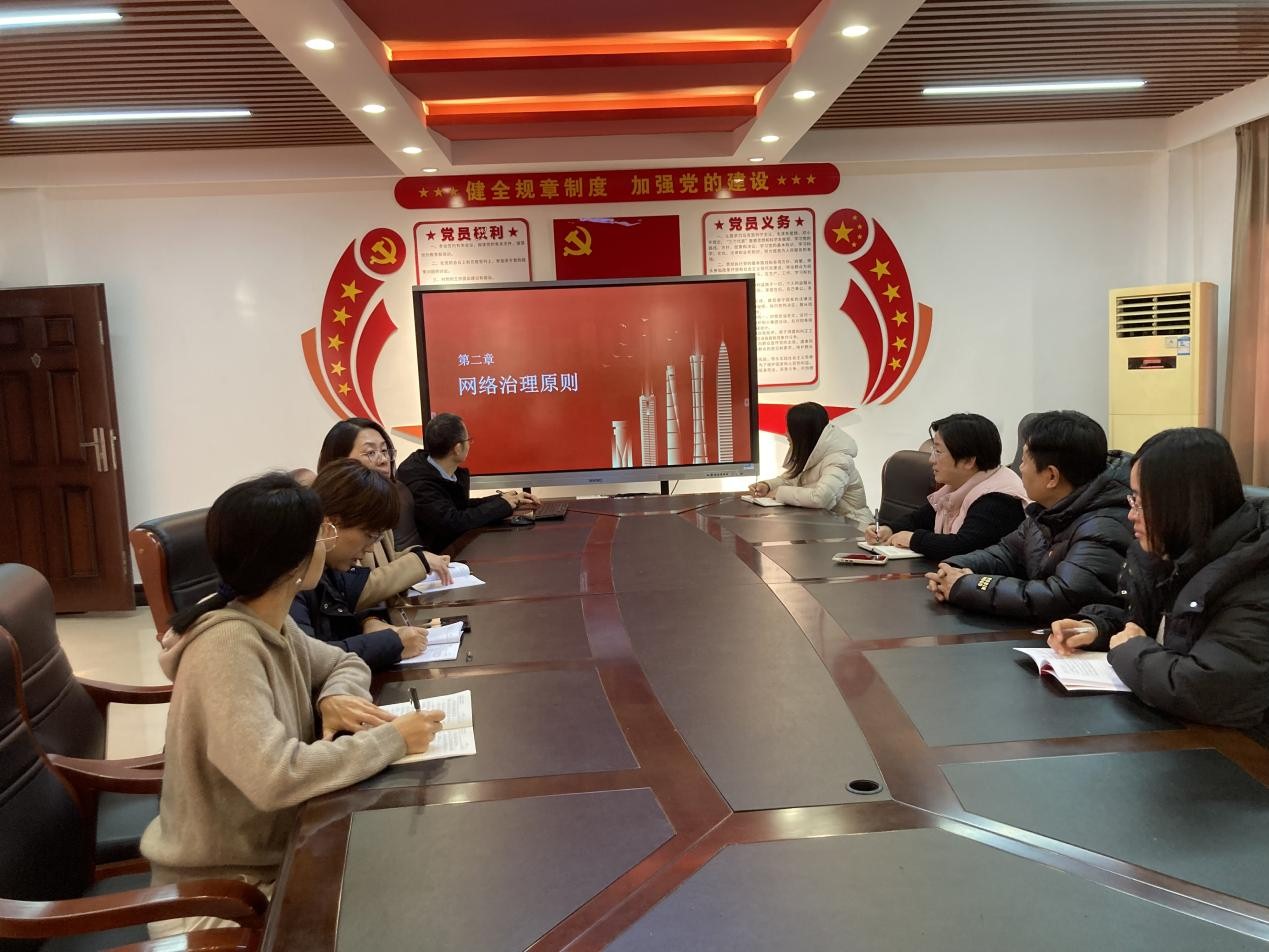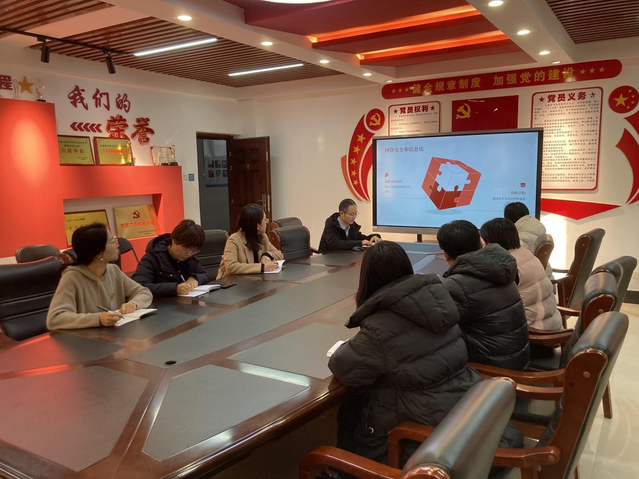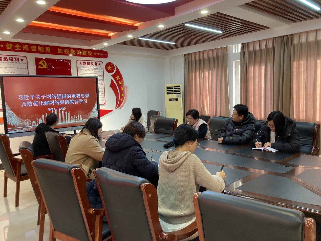 12月26日,现代信息技术学院教师第一党支部在笃行楼五楼会议室顺利召开“习近平总书记关于网络强国的重要思想及防范化解网络舆情教育”专题会议。此次会议聚焦深入学习领会党中央关于网络强国建设的战略部署,旨在增强教师的网络安全意识,提升其防范和化解网络舆情的能力。会议由党支部书记翟慧主持,全体党员踊跃参与学习讨论。