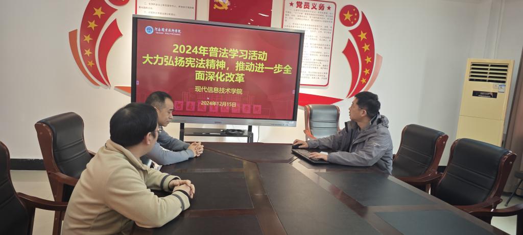 在全力推进法治社会建设的时代背景下,为切实强化教职工的法律意识,有效提升依法治教、依法从教的专业能力,现代信息技术学院公共基础教研室于2024年12月15日成功举办了一场独具特色的普法学习活动。此次学习活动紧密围绕与教育领域息息相关的法律法规展开,借助生动鲜活的案例剖析以及通俗易懂、鞭辟入里的讲解,使得参与学习的教职工对教育领域的法律规定有了更为全面、深刻的认识。教职工们纷纷表示,此次学习活动不仅显著提升了自身的法律素养,更为今后在工作中更好地维护学生合法权益、规范教学行为提供了坚实有力的法律保障。此次普法学习活动的圆满成功,不仅极大地增强了公共基础教研室教职工的法律意识,更为学院法治文化建设筑牢了坚实根基。展望未来,教研室将持续开展形式丰富多样的普法教育活动,致力于营造尊法学法守法用法的优良氛围。