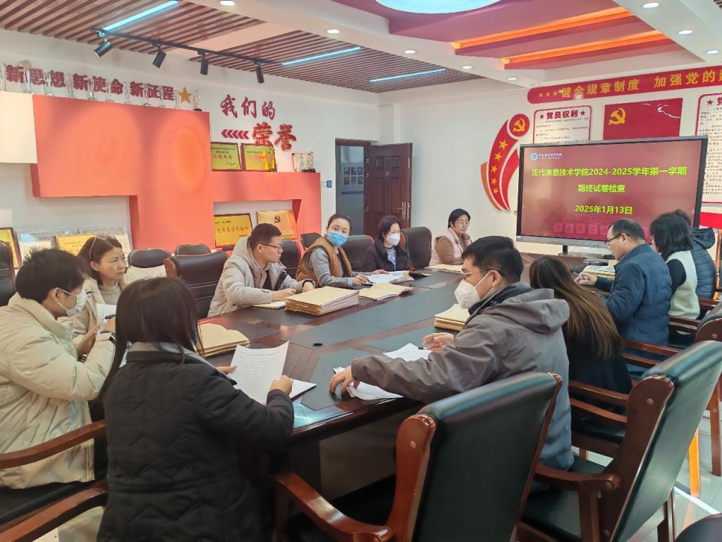为规范教学资料管理,提升教学质量,1月13日下午现代信息技术学院在笃行楼508会议室开展期终试卷专项检查工作。本次检查覆盖学院7个专业38个行政班,旨在全面了解期终试卷的命题质量、评阅规范性以及成绩登录的准确性等情况。