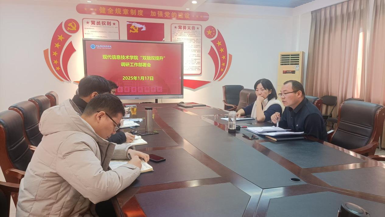 为深入推进“双融双提升”工作,明确调研方向与任务,现代信息技术学院与1月17日召开了“双融双提升”调研工作部署会。本次会议由党总支书记、院长李纪云主持,副院长董俊磊、各教研室主任共同参与此次会议。