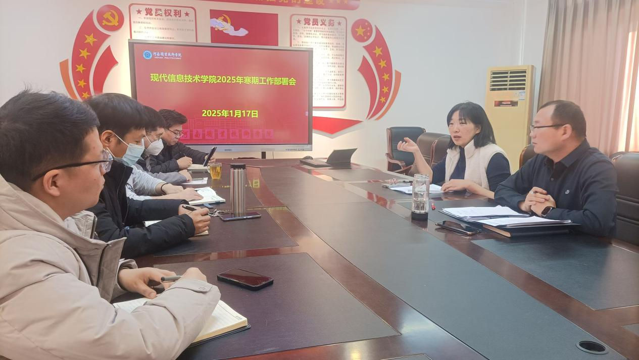 为确保学院寒假期间各项工作平稳有序推进,现代信息技术学院与1月17日召开了2025年寒期工作部署会。本次会议由党总支书记、院长李纪云主持,副院长董俊磊、各教研室主任共同参与此次会议,共同谋划寒期工作蓝图。