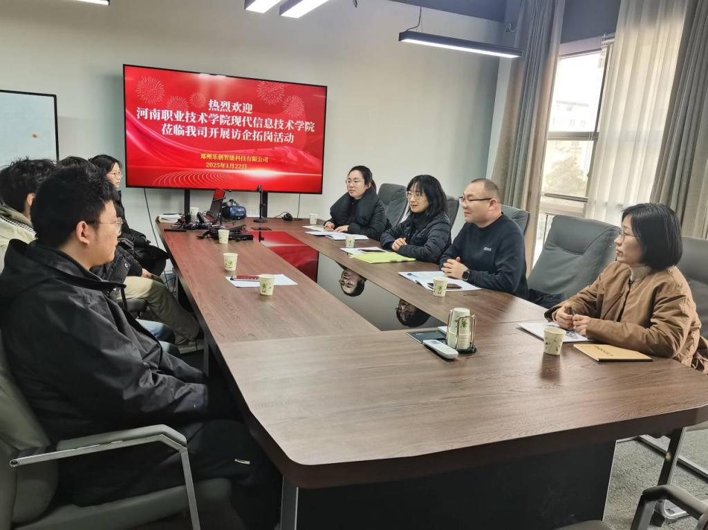 1月22日上午,现代信息技术学院院长李纪云带队前往郑州乐创智能科技有限公司开展访企拓岗活动,副院长董俊磊、虚拟现实技术应用教研室主任贾亚娟及专业老师陪同参加。