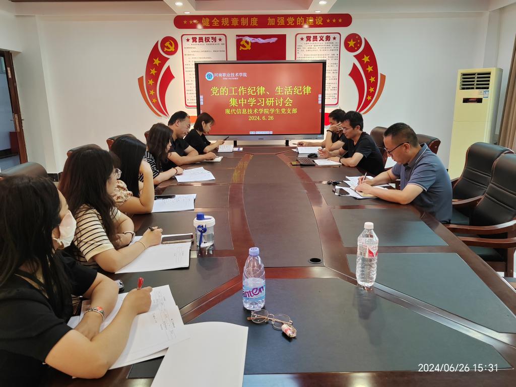 为深入学习贯彻党的二十大精神,进一步加强党员的党性修养,提升党员队伍的纪律意识和规矩意识,现代信息技术学院学生党支部于6月26日,在508会议室召开了党的组织纪律与生活纪律集中学习研讨会。本次研讨会由党总支副书记郑宝林同志主持,学生支部全体党员积极参与,共同探讨了如何在日常学习和生活中更好地践行党的纪律要求。