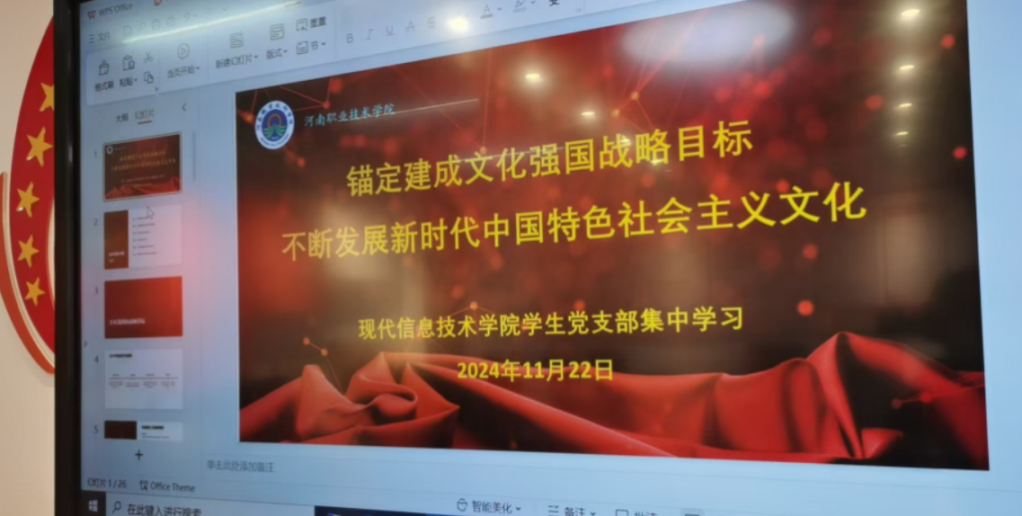 11月22日下午,现代信息技术学院学生党支部全体党员在笃行楼508会议室组织了一次专题学习活动,深入学习了习近平总书记在中共中央政治局第十七次集体学习时关于建设文化强国的重要讲话精神。本次活动旨在深入领会讲话的核心要义,进一步明确文化强国建设的战略目标和实践路径,增强党员的文化使命感和责任感。