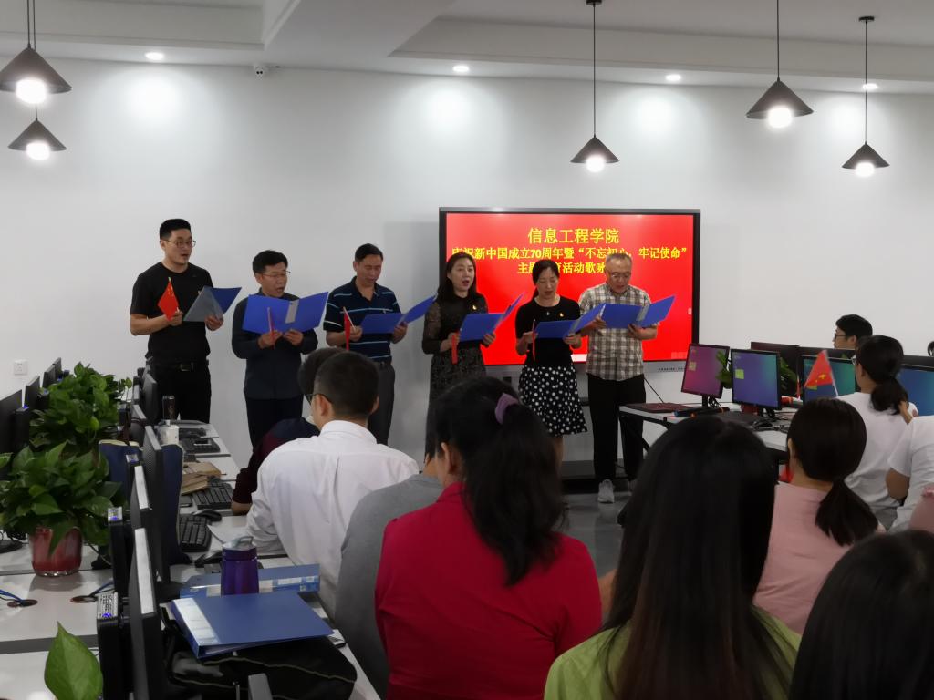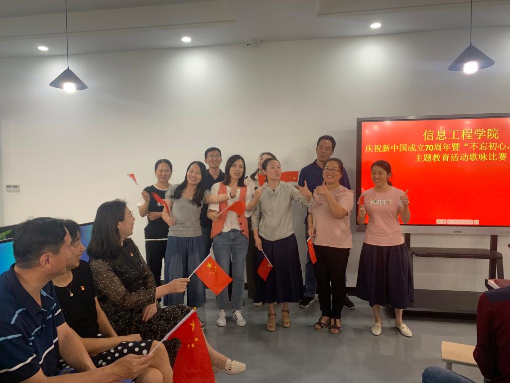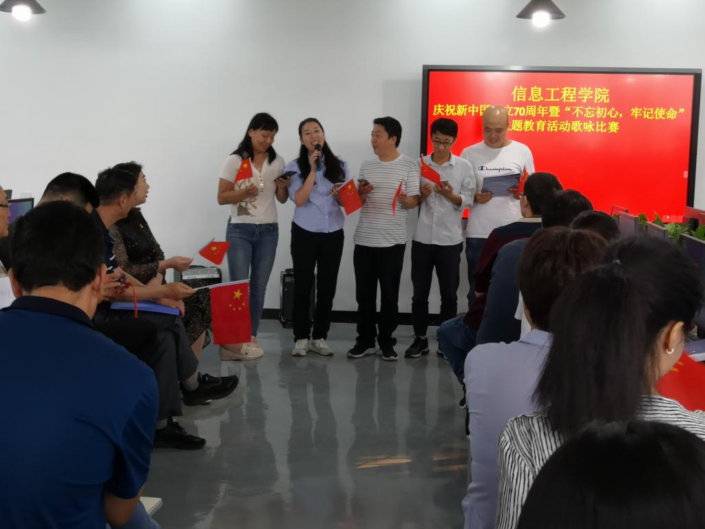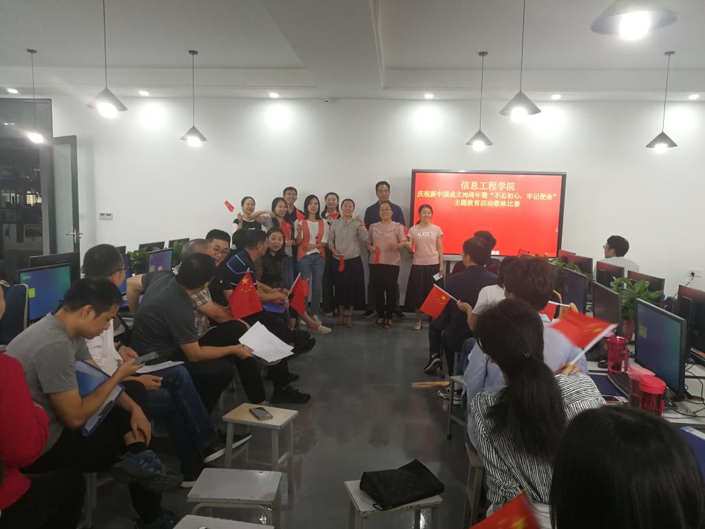 为庆祝新中国成立70周年,深入学习贯彻习近平新时代中国特色社会主义思想和党的十九大精神,信息工程学院于9月30日在笃行楼312室开展了“不忘初心•牢记使命”主题教育歌咏比赛。教职工们以教研室为单位,演绎了《祖国啊,我亲爱的祖国》、《南泥湾》、《打靶归来》、《我和我的祖国》、《我的中国心》等一曲曲耳熟能详的红色经典歌曲。大家认真投入,群情激昂,唱出了对祖国的无限热爱。