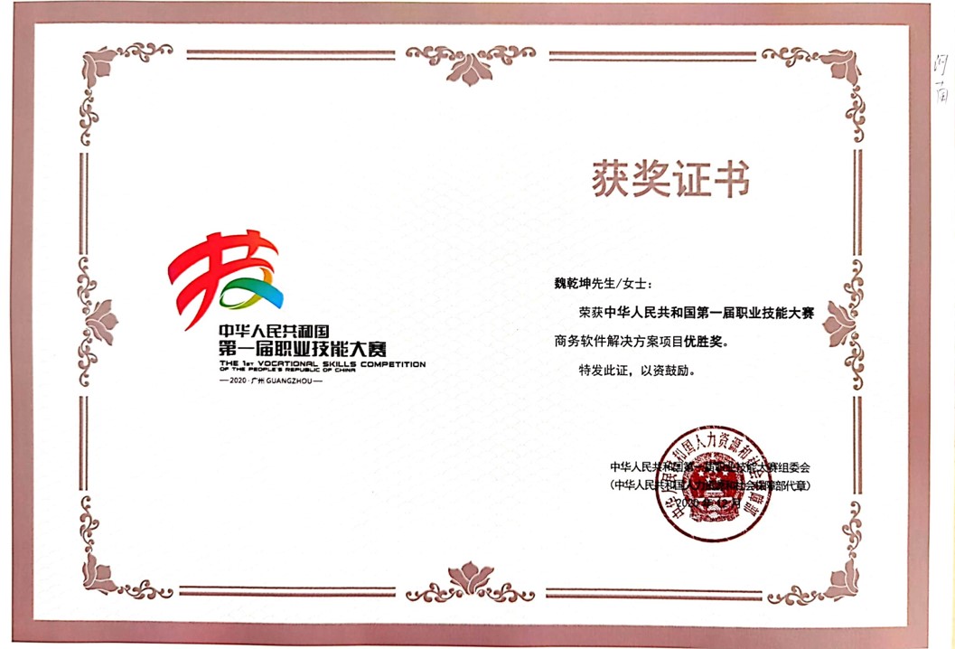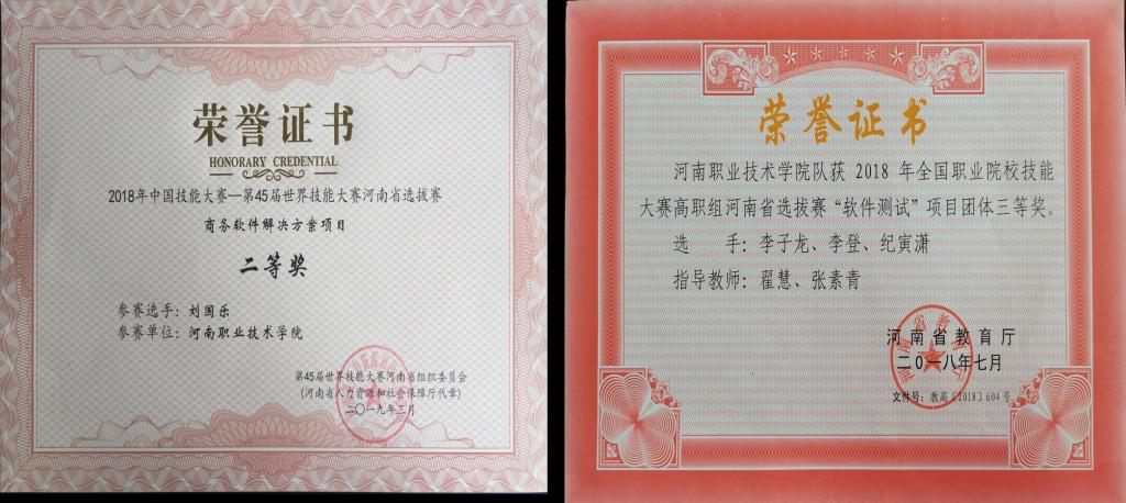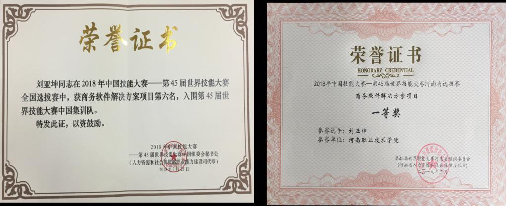 2020年,在第46届世界技能大赛河南省选拔中取得了第一名和第二名的成绩;在国赛选拔赛中获得优胜奖并成功晋级国家集训队。