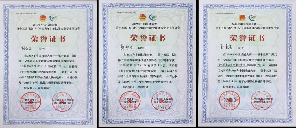 2019年,在中国技能大赛—第十五届“振兴杯”全国青年职业技能大赛国赛中取得了第9、15、20名,三位选手均被授予“第20届全国青年岗位能手”称号。