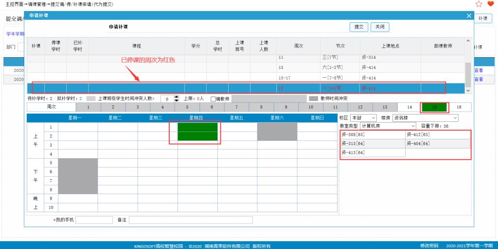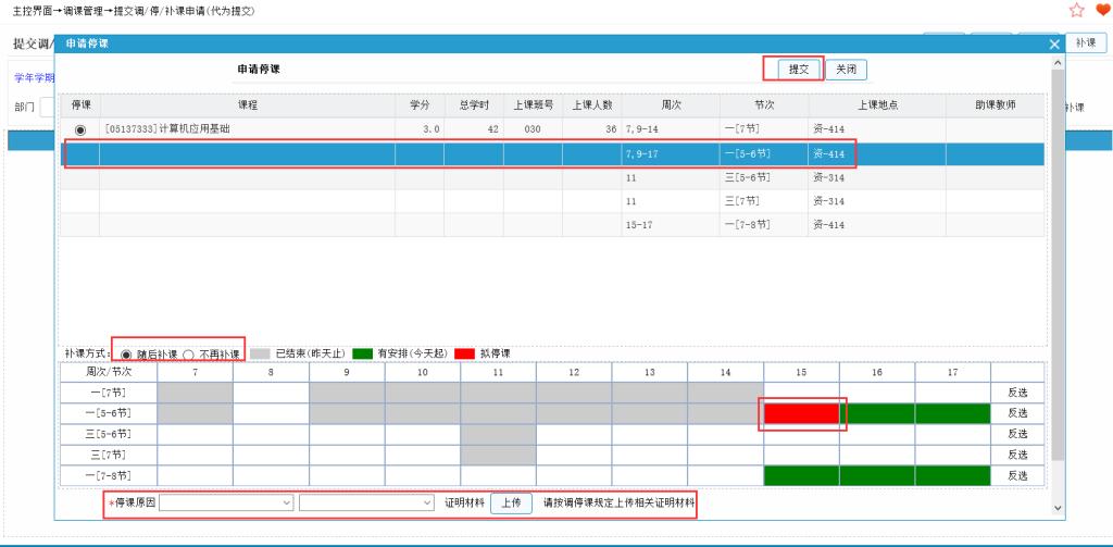 补课:选择已停课的周次(已停课的周次为红色),选择要补的周次、节次和教室,后点击提交即可。