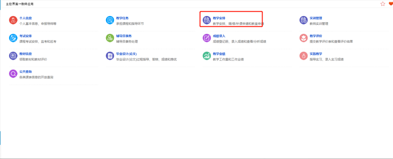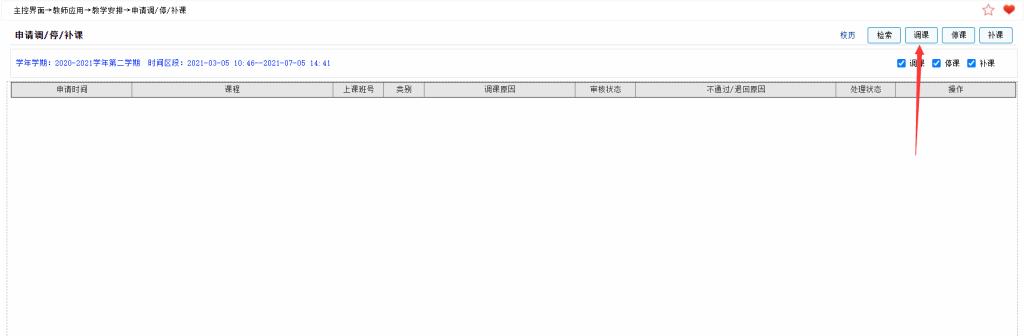 教师申请时进入教师应用点击教学安排,选择申请调停课。