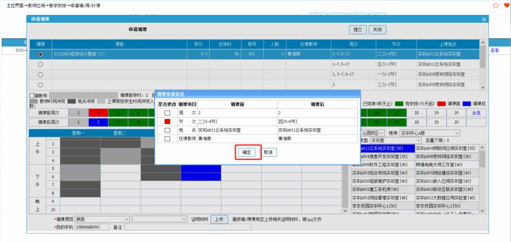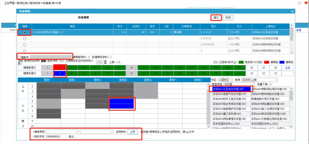 点击调课,进入调课界面。勾选需要调整课程的节次,如果是只换节次,点击调课前周次,调课后周次默认选中,选择需要调整的节次,选择相应的教室,填写调课原因,手机号,证明材料点击提交,查看信息后点击确认即可。