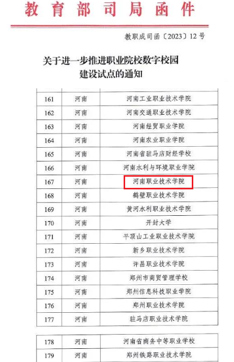 近日,教育部职成司发布《关于进一步推进职业院校数字校园建设试点的通知》,公布了第一批职业院校数字校园建设试点学校名单,河南共19所学校入选,河南职院名列其中。