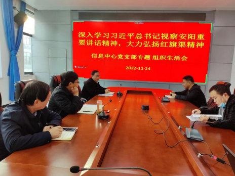2022年11月24日下午,信息中心党支部在电教楼412会议室召开“深入学习习近平总书记视察安阳重要讲话精神,大力弘扬红旗渠精神”专题组织生活会。会议通过线上、线下相结合的方式召开,党支部全体党员参加,会议由支部书记谭营军主持。