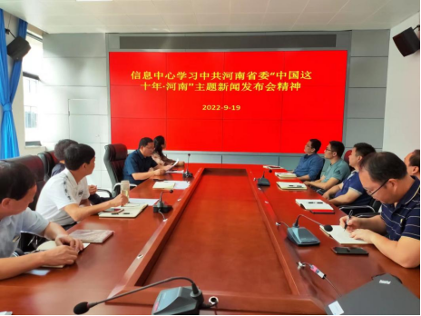 9月19日上午,信息中心全体教职工在电教楼412学习中共河南省委“中国这十年·河南”主题新闻发布会精神,会议由信息中心主任谭营军主持。